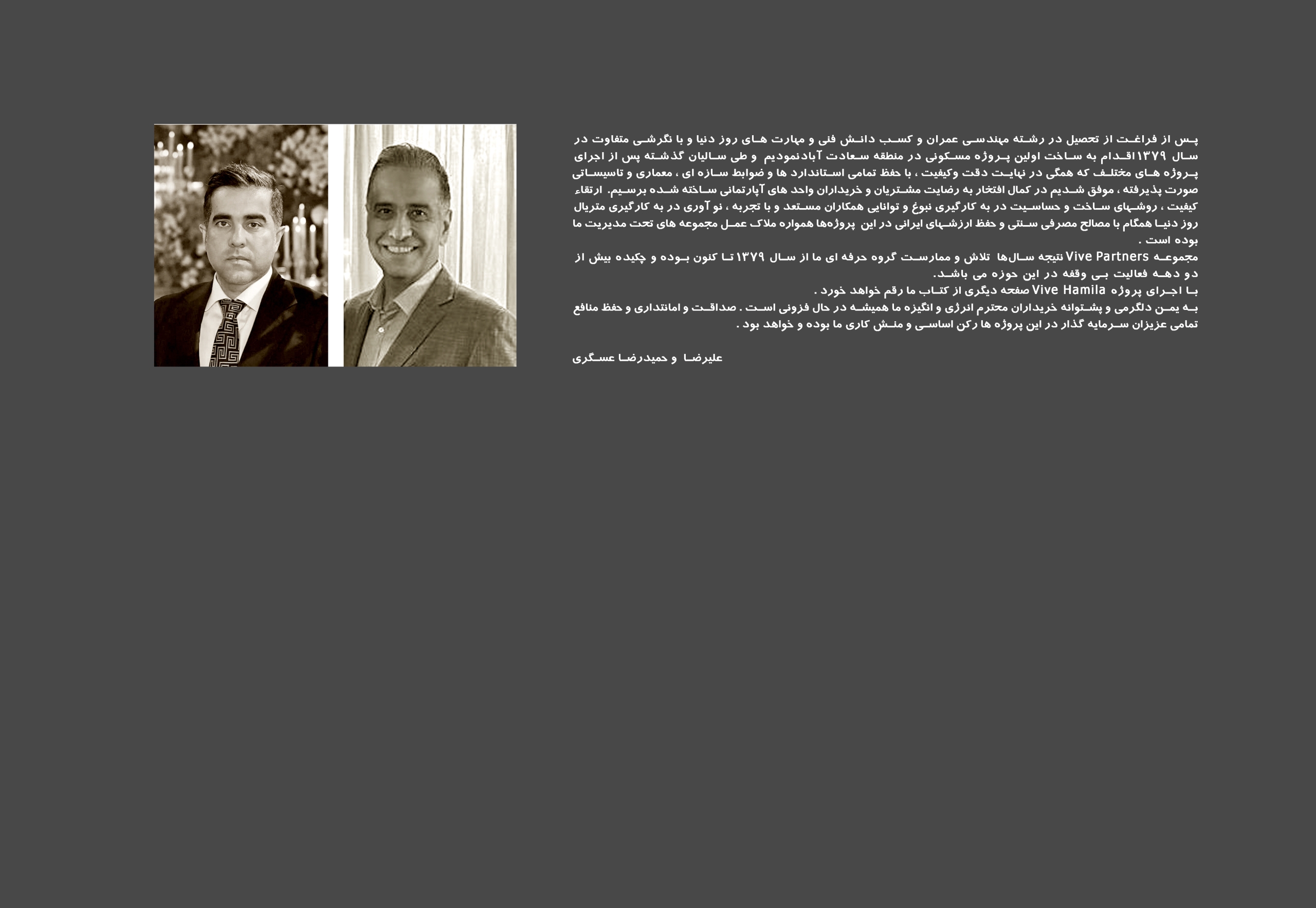 نمای شمالی ( برج شمالی ) تعداد برج : دو برج A و B متراژ کل بنا : 50 هزار متر مربع تعداد کل طبقات : 18 طبقه تعداد واحد مسکونی : 151 واحد تعداد طبقات مشاعات : 4 طبقه تعداد طبقات پارکینگ : 3 طبقه تعداد آسانسور ها : 6 عدد